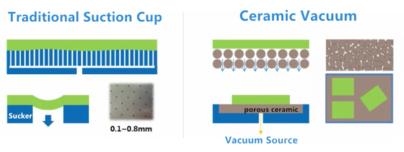 సాంప్రదాయ లోహ చక్లు అసమాన చూషణ శక్తిని కలిగి ఉంటాయి, సన్నని పదార్థాలపై వైకల్యానికి గురవుతాయి, యాంటీ-స్టాటిక్ లక్షణాలు లేవు మరియు వాటి తక్కువ కాఠిన్యం కారణంగా ధరించడానికి మరియు చిరిగిపోయే అవకాశం ఉంది. మరోవైపు, సిరామిక్ వాక్యూమ్ చక్లు సన్నని భాగాలకు అనుకూలంగా ఉంటాయి, యాంటీ-స్టాటిక్ లక్షణాలను అందిస్తాయి మరియు దుస్తులు-నిరోధకత మరియు తుప్పు-నిరోధకతను కలిగి ఉంటాయి.