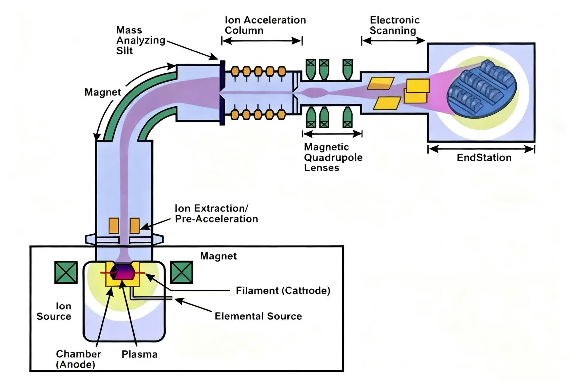 2.అయాన్ ఇంప్లాంటేషన్ అనేది సెమీకండక్టర్ తయారీలో ప్రాథమిక డోపింగ్ టెక్నిక్, ఇది అధిక డోపింగ్ ఖచ్చితత్వం, తక్కువ ప్రక్రియ ఉష్ణోగ్రతలు మరియు సబ్స్ట్రేట్ మెటీరియల్కు తక్కువ నష్టం వంటి అనేక ప్రయోజనాలను కలిగి ఉంది. ప్రత్యేకించి, అయాన్ ఇంప్లాంటేషన్ ప్రక్రియ చార్జ్డ్ అయాన్లను సృష్టించడానికి అయోనైజింగ్ అశుద్ధ అణువులను కలిగి ఉంటుంది, ఆపై ఈ అయాన్లను అధిక-తీవ్రత గల విద్యుత్ క్షేత్రం ద్వారా వేగవంతం చేసి అధిక-శక్తి అయాన్ పుంజం ఏర్పడుతుంది. సెమీకండక్టర్ ఉపరితలం ఈ వేగంగా కదిలే అయాన్లచే కొట్టబడుతుంది, సర్దుబాటు చేయగల డోపింగ్ డెప్త్తో ఖచ్చితమైన ఇంప్లాంటేషన్ను అనుమతిస్తుంది. MOSFETల మూలం మరియు కాలువ ప్రాంతాలు వంటి నిస్సార జంక్షన్ నిర్మాణాలను రూపొందించడానికి ఈ సాంకేతికత ప్రత్యేకంగా ఉపయోగపడుతుంది మరియు మలినాలను పంపిణీ మరియు ఏకాగ్రతపై అధిక-ఖచ్చితమైన నియంత్రణను అనుమతిస్తుంది.