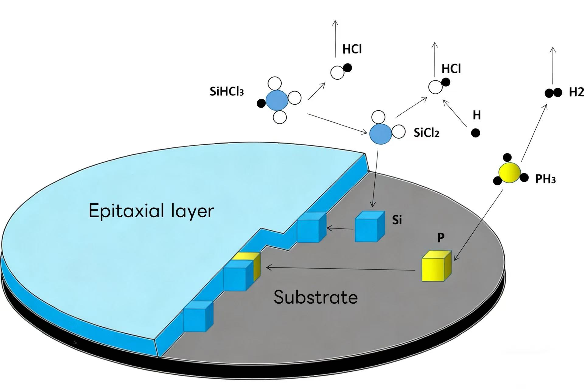సిలికాన్ ఎపిటాక్సీ సాధారణంగా ఆవిరి దశ ఎపిటాక్సీ కొలిమిని ఉపయోగిస్తుంది. సిలికాన్ మూలం యొక్క కుళ్ళిపోవడం (సిలేన్, డైక్లోరోసిలేన్, ట్రైక్లోరోసిలేన్ మరియు సిలికాన్ టెట్రాక్లోరైడ్ వంటివి హైడ్రోజన్తో చర్య జరిపి సిలికాన్ను ఉత్పత్తి చేస్తాయి. పెరుగుదల సమయంలో, PH₃ మరియు B₂H₆ వంటి డోపింగ్ వాయువులను ఏకకాలంలో ప్రవేశపెట్టవచ్చు. డోపింగ్ భాగానికి ముందుగా పీడనం ఏర్పడుతుంది. నిర్దిష్ట రెసిస్టివిటీతో ఎపిటాక్సియల్ పొర.