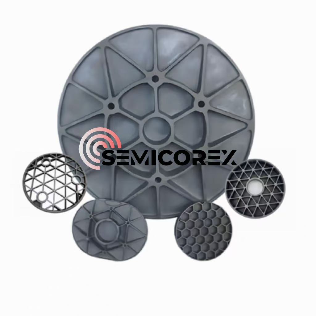 కార్యాచరణ సౌలభ్యాన్ని మెరుగుపరచడానికి మరియు పరికరాల శక్తి వినియోగాన్ని తగ్గించడానికి, సెమికోరెక్స్ అధిక దృఢత్వాన్ని ఉపయోగిస్తుందిసిలికాన్ కార్బైడ్మిర్రర్ బ్లాంక్లను తయారు చేయడానికి మరియు సిలికాన్ కార్బైడ్ ప్రతిబింబించే అద్దాల యొక్క తేలికపాటి అవసరాలను సాధించడానికి ఖాళీలలో సంక్లిష్టమైన జాలక నిర్మాణాలను కలిగి ఉంటుంది. మెటీరియల్ ఎంపిక మరియు నిర్మాణ రూపకల్పన యొక్క ఈ తెలివిగల కలయిక సిలికాన్ కార్బైడ్ ప్రతిబింబించే అద్దాల బరువును గణనీయంగా తగ్గిస్తుంది, అయితే వాటి దృఢత్వాన్ని కొనసాగిస్తుంది. ఫలితంగా, సిలికాన్ కార్బైడ్ ప్రతిబింబించే అద్దాలు ఏరోస్పేస్ మరియు లోతైన అంతరిక్ష అన్వేషణ వంటి రంగాలలో భర్తీ చేయలేని ప్రయోజనకరమైన స్థానాన్ని ఆక్రమించాయి.